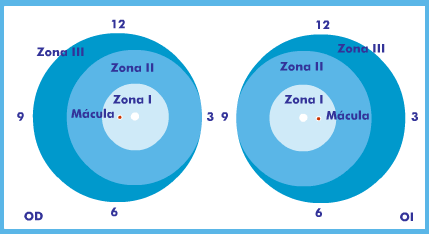 zona I a la ora serrata nasal (a la hora 3 en el ojo derecho y a